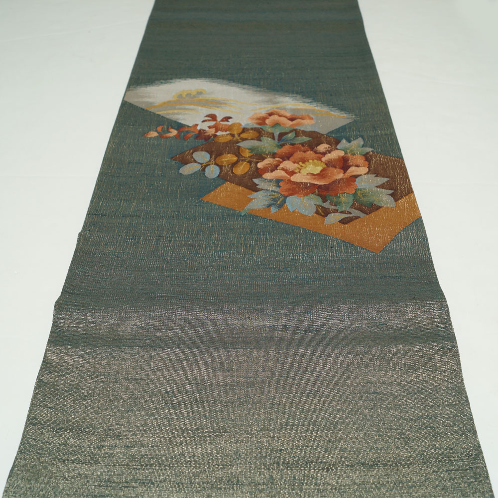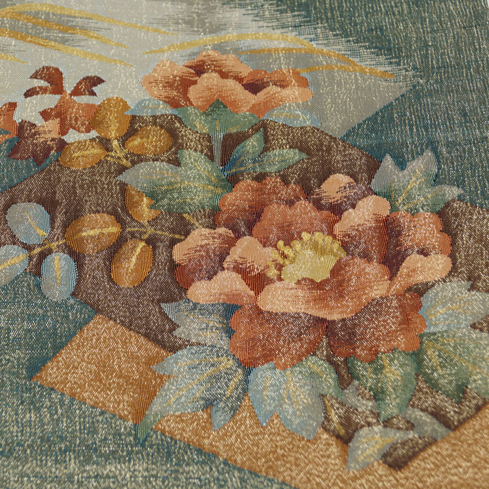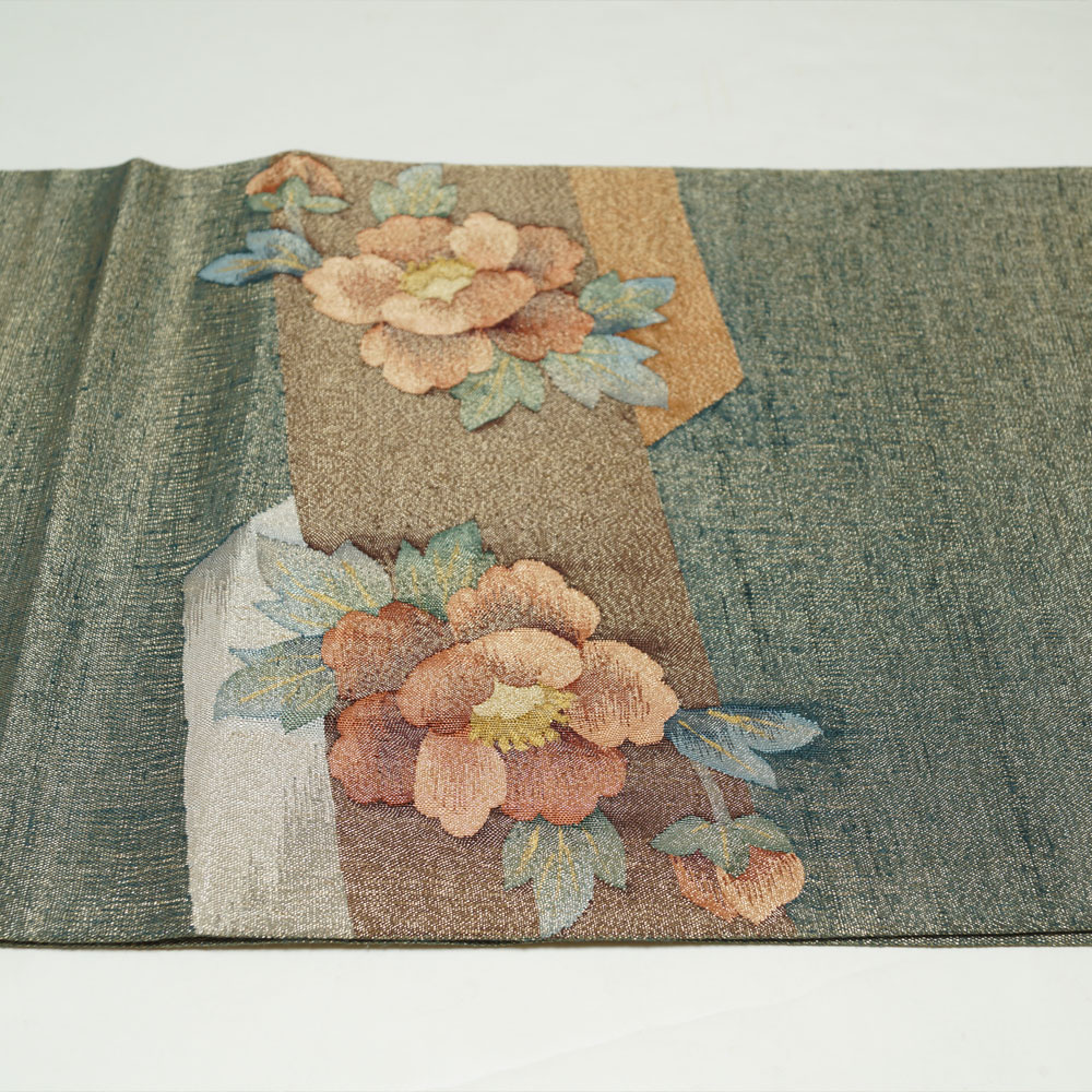 > 袋帯 未使用品 取方に牡丹・萩・桔梗模様 紬地 金通し 洒落袋帯 深緑色系 中古 袋帯 リサイクル リサイクル着物 着物 仕立て上がり 天陽