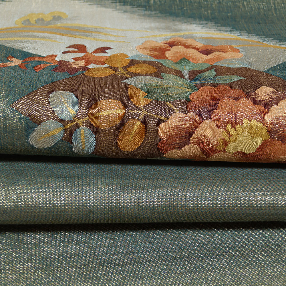 - 袋帯 未使用品 取方に牡丹・萩・桔梗模様 紬地 金通し 洒落袋帯 深緑色系 中古 袋帯 リサイクル リサイクル着物 着物 仕立て上がり 天陽