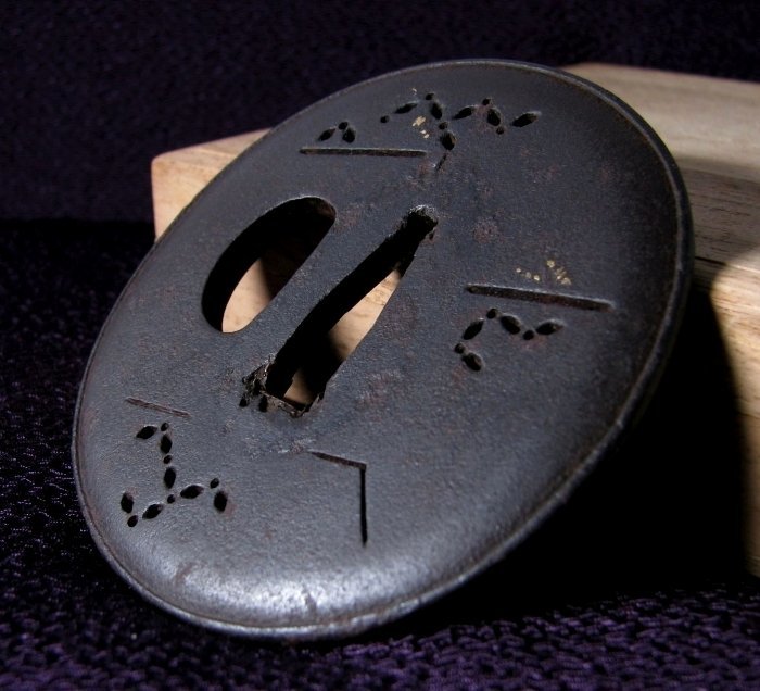 - 時代武具 鉄地鍔 象嵌入り 糸目透かし 桐箱付 江戸時代/鐔/24a039