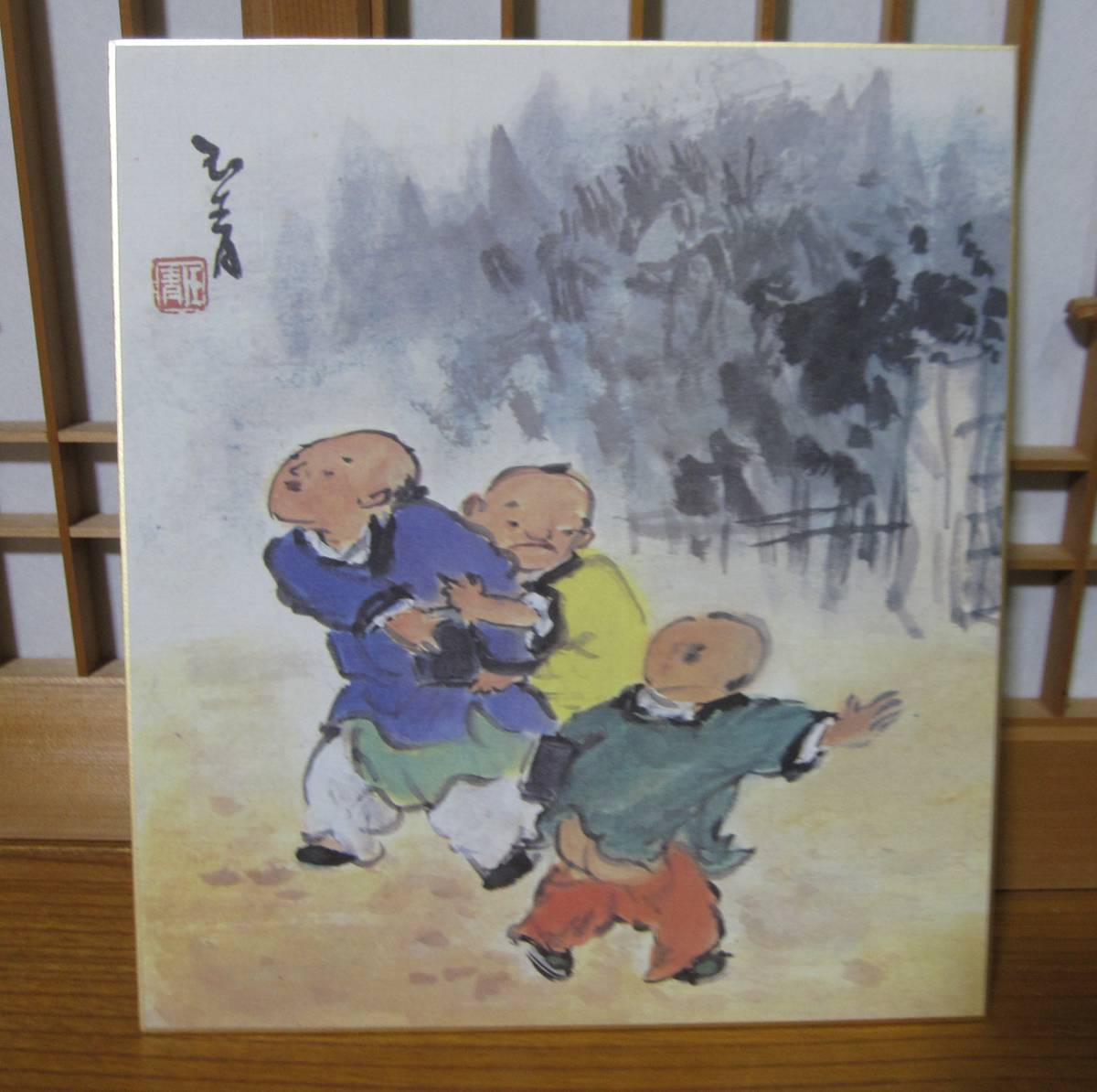 - 色紙 唐子 水彩 作家物 複製画。茶掛け 状態は良いです。掛軸 短冊 からこ 色絵色紙