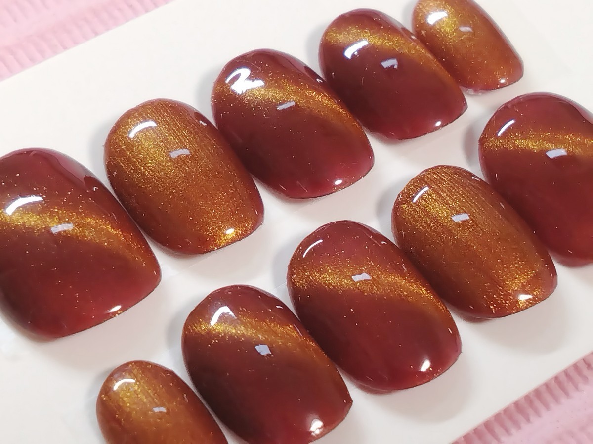 > 【ジェルネイル】Mサイズベリーショート・スイートチョコブラウンゴールドキャッツアイマグネットジェルネイルチップ付け爪