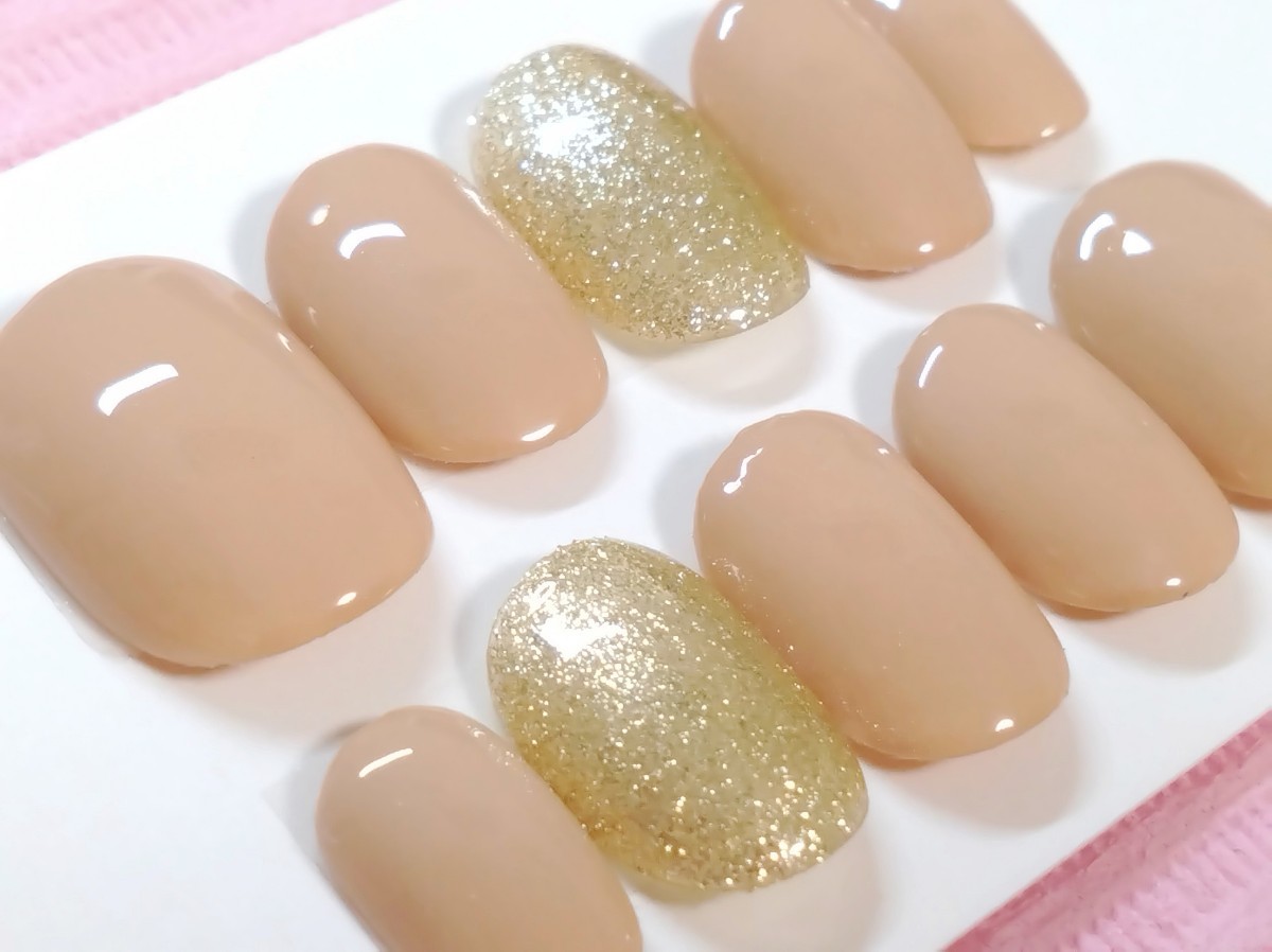 - 【ジェルネイル】Lサイズベリーショート・こってりベージュワンポイントゴールドラメシンプルネイルチップ付け爪Handmade