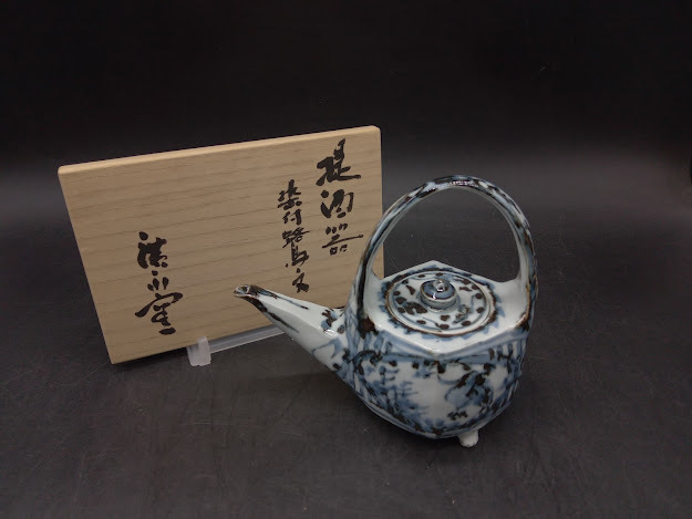 - ▽ 【5】 染付路鳥文 提酒器 / 酒次 酒器 鷺 三足付 落款 在銘 印有 銘有 木箱 共箱 銚子 茶道具 真作