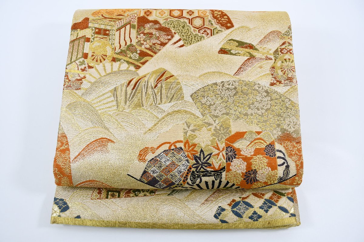 - 名古屋帯 アンティーク 扇面 花 リバーシブル 帯丈404cm ★着物屋 ne-7651桜庭呉服店