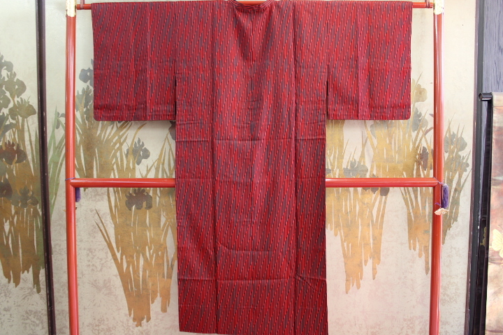 - きもの今昔6471 雨コート 西陣織正絹雨コート生地 赤地に黒の斜め切小縞模様 コート丈132cm