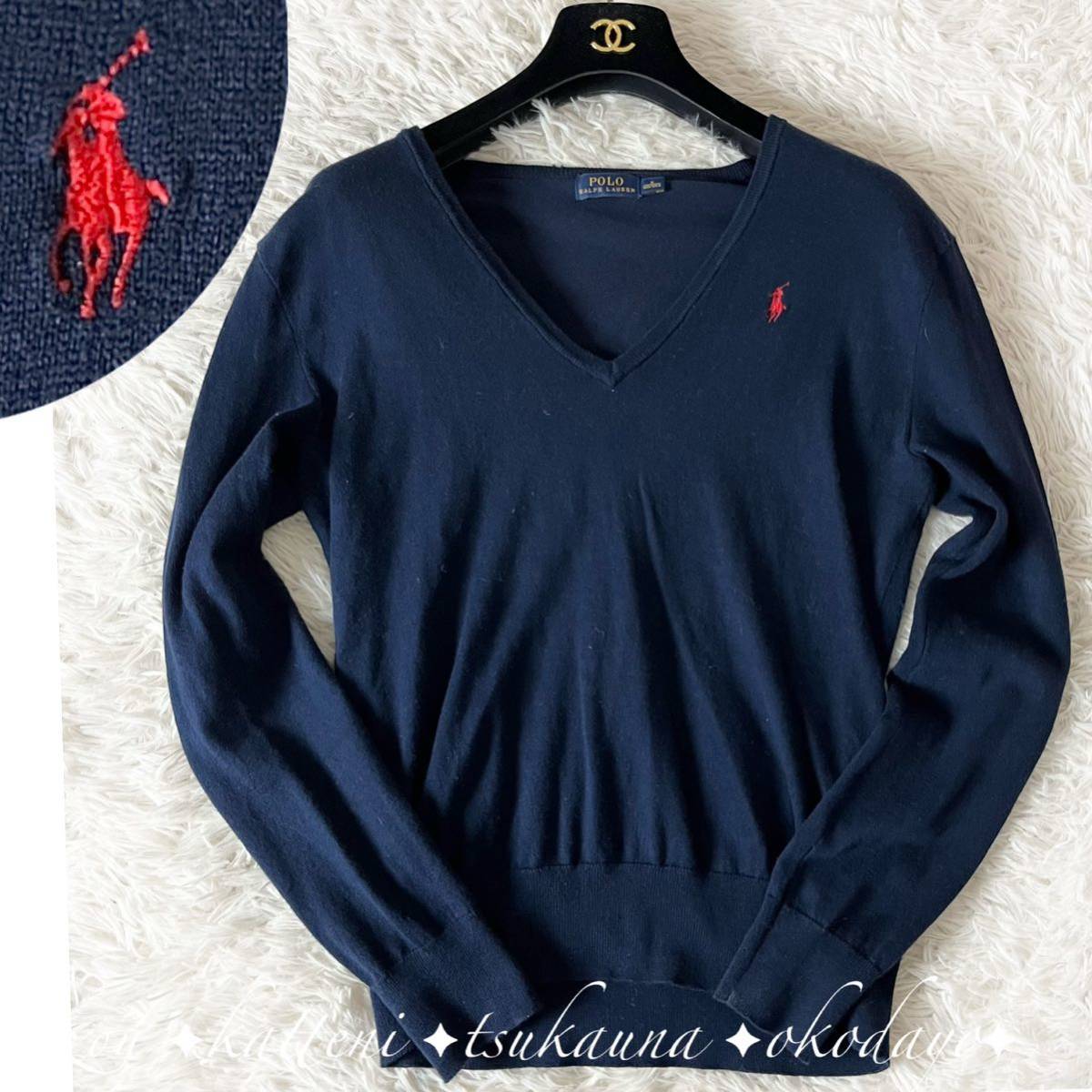 - POLO RALPH LAUREN ポロラルフローレン コットン ニット セーター ワンポイント刺繍 ポニー 紺 ネイビー 長袖 リブ袖 Vネック S M