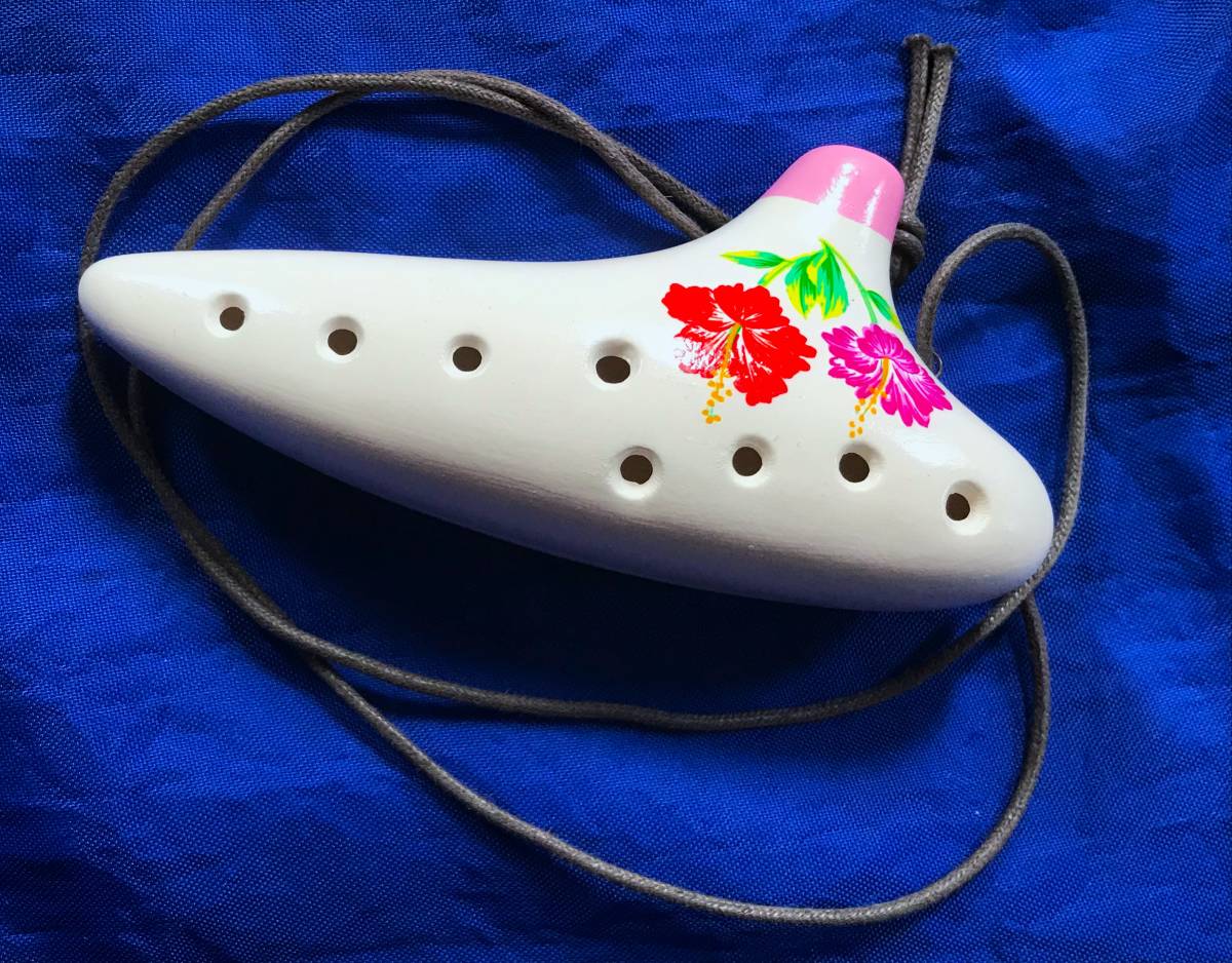 - 【美品/未使用】可愛らしいハイビスカスの絵入り 陶器素焼製 手作り オカリナ 紐・パッケージ付き 楽器 笛 土産物