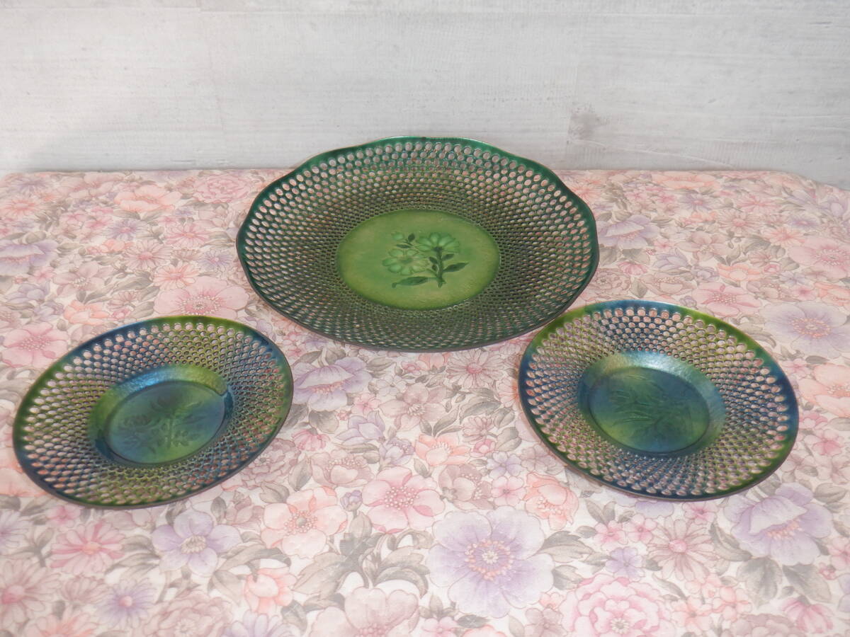 - D2『青銅器? 玉利久 皿セット 菓子皿&茶托2枚 工芸品~花の七宝焼』~箱なし 長期保管品