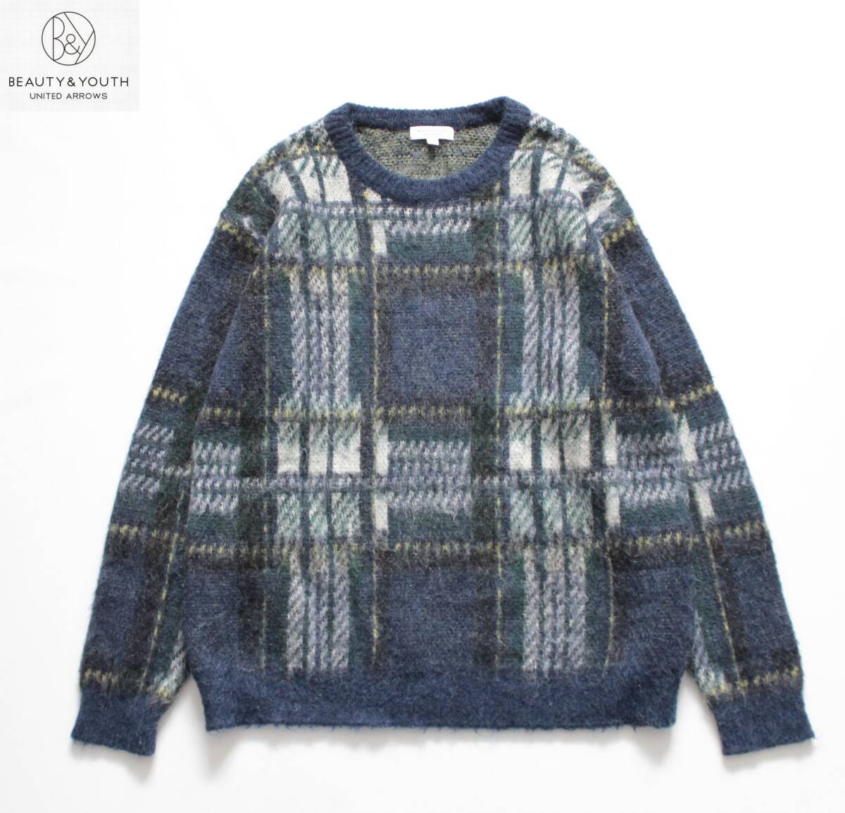 - 【 BEAUTY&YOUTH ユナイテッドアローズ 】ロイヤル タータンチェック シャギー ニット セーター S 12131053482 定価\15,400 クルーネック