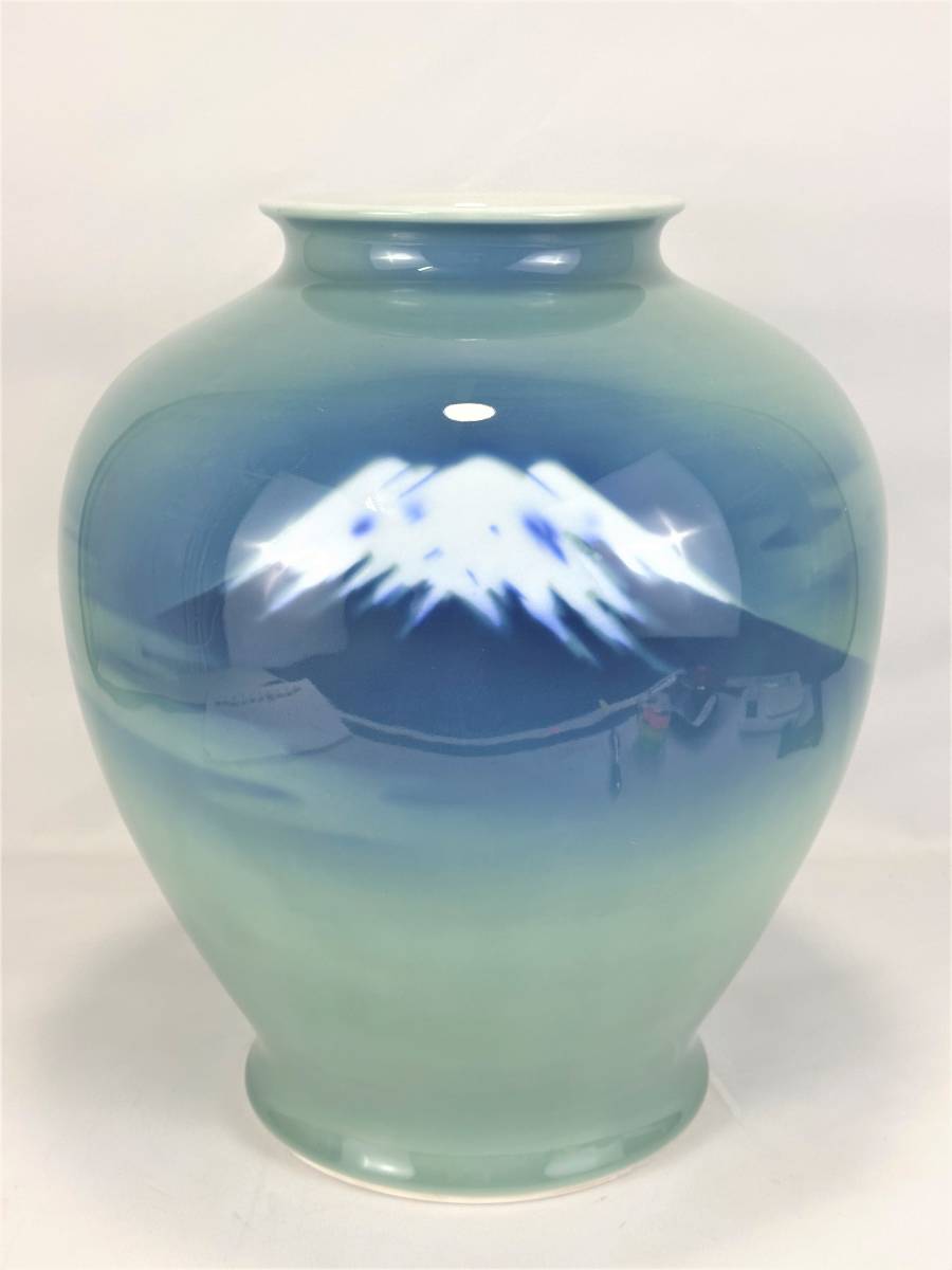 > E73●深川製磁・富士山青磁花瓶 花器 染付 花生 富士山 宮内庁御用達 深川 有田焼 陶器花器 美品 飾壺 床飾 重さ約:3.4kg