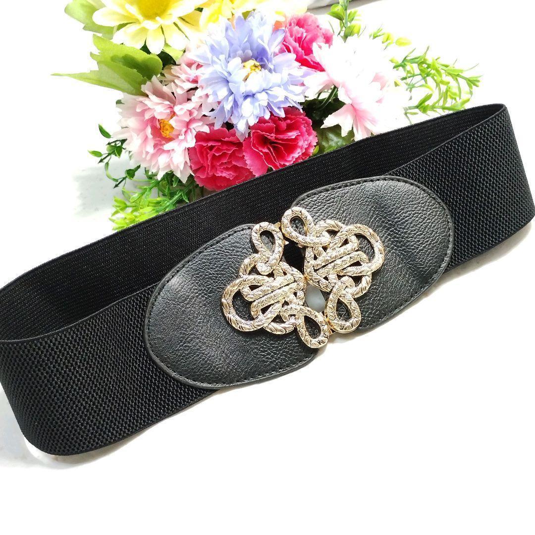 - 【ブラック】約6cm 幅広ゴムベルト68cm~85cmゴールドバックルレディース