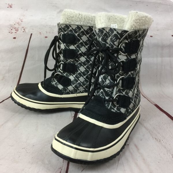 - カナダ名門★SOREL/ソレル★完全防水/スノーブーツ【22.5/黒×グレー】総柄/インナー付◆KM23