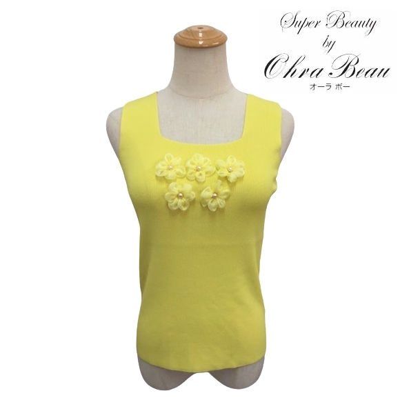 > スーパービューティー 42 ノースリーブニット 胸元花モチーフ インナーニット L 2411018 イエロー 2024年春夏 大人可愛い