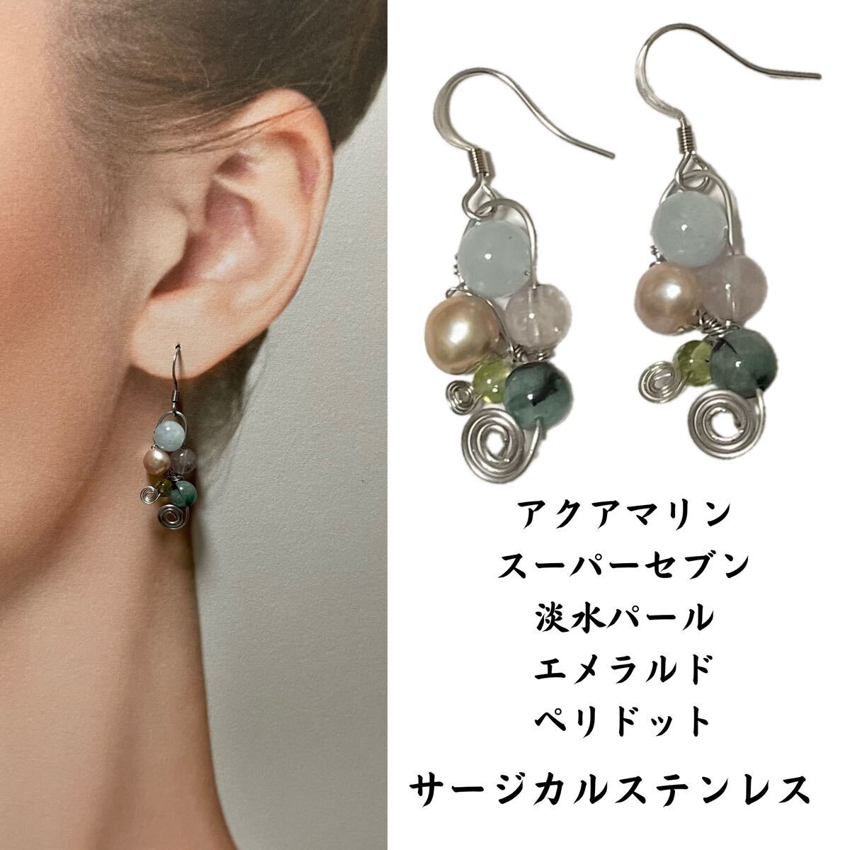 > G27. 天然石 ピアス アクアマリン スーパーセブン 淡水パール エメラルド サージカルステンレス アレルギーフリー ニッケルフリー
