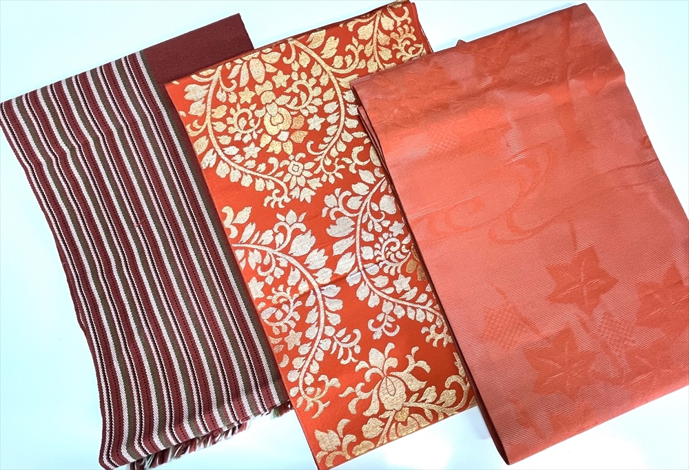 > 花とら●リサイクル帯 名古屋帯 3本まとめて 橙系 紗 楓 橙金 欧風文様 モスリン 縦縞 240401