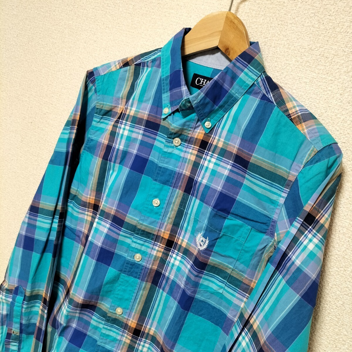 > 美品☆CHAPS ボタンダウン コットンシャツ チェック柄 長袖 刺繍ロゴ メンズ サイズS ブルー チャップス ラルフローレン ブランド古着 USED