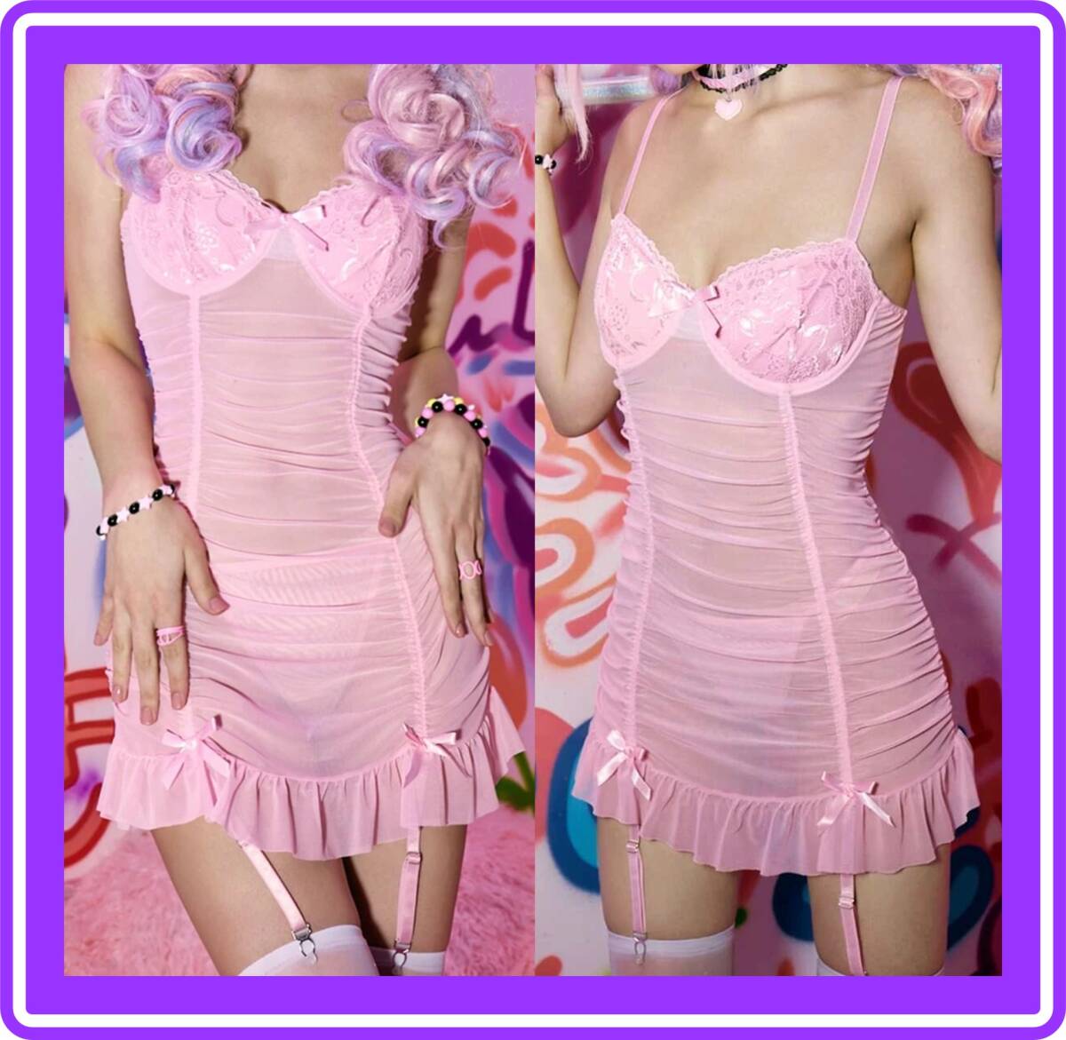 - ★超素敵★アンダーワイヤー式★ガーターランジェリーセット★フック取り外し可能★メッシュ★レース★V58