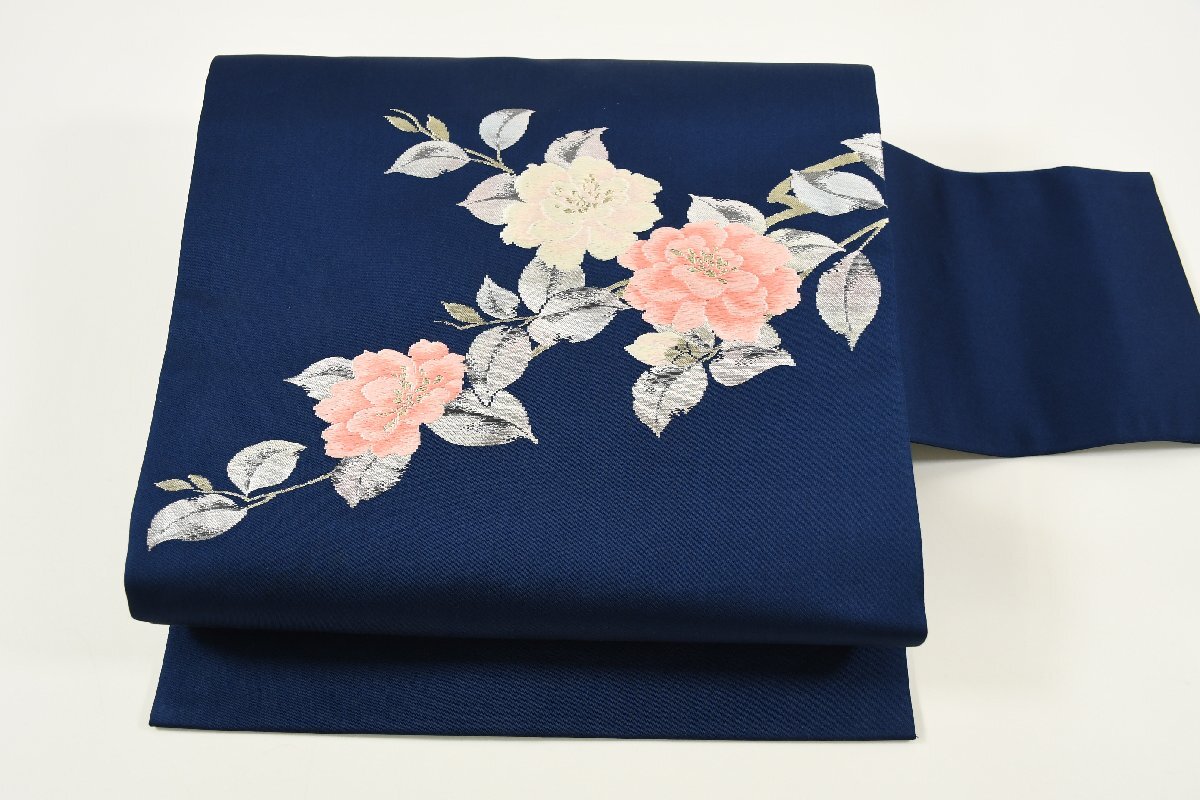 > 名古屋帯 紺 花 帯丈354cm ★着物屋 ne-9442 桜庭呉服店