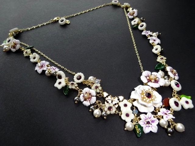 > ● フランス レネレイド 2連ネックレス 花 白 葉っぱ ラインストーン ビジュー 小花 蝶々 パール ゴールド Les Nereides 新品 N2 エヌドゥ