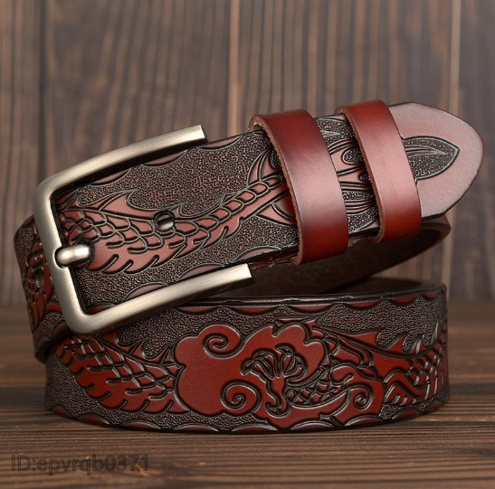 > レザーベルト 新品 ピンバックル式 本革 龍柄 メンズベルト 幅3.8センチ 紳士 フリーサイズ ポンチ付き 長さ調整可能 2色選ぶ/ワイン