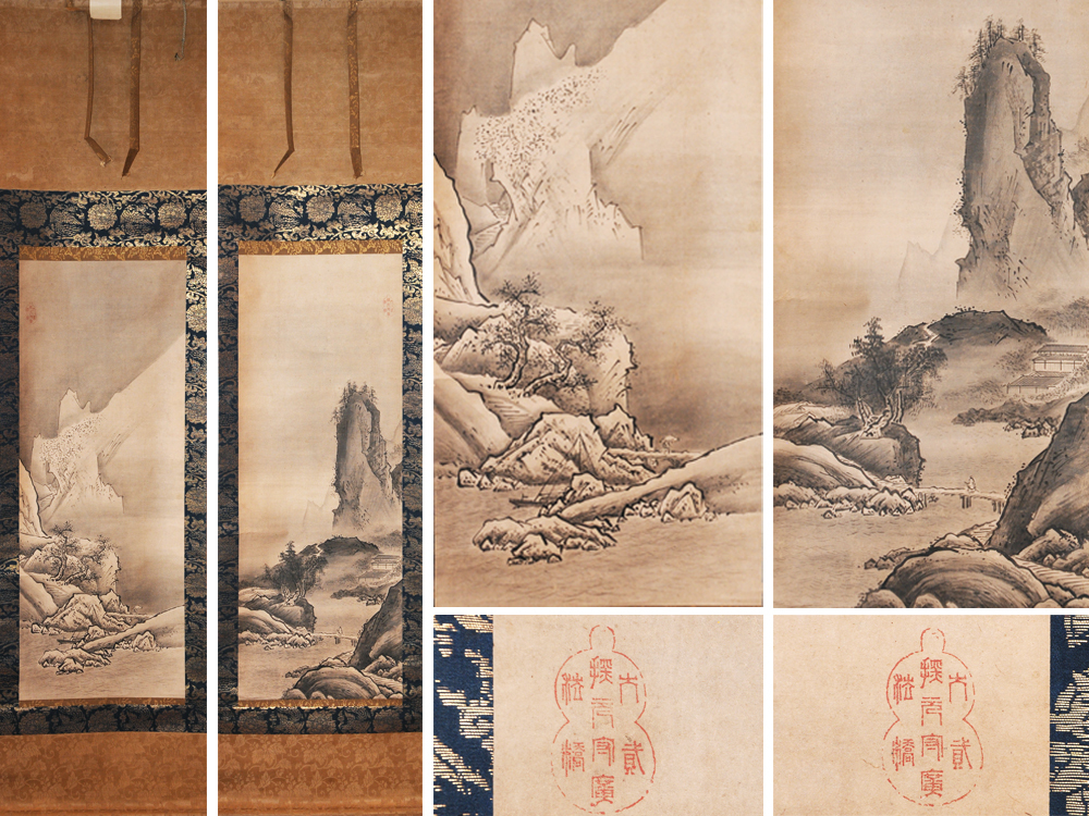 > 【真作】木村探元 大弐 (筆) 紙本 春冬破墨山水図 対幅 掛軸 一対 掛け軸 軸 茶道具 水墨画 書画 絵画 z6116t