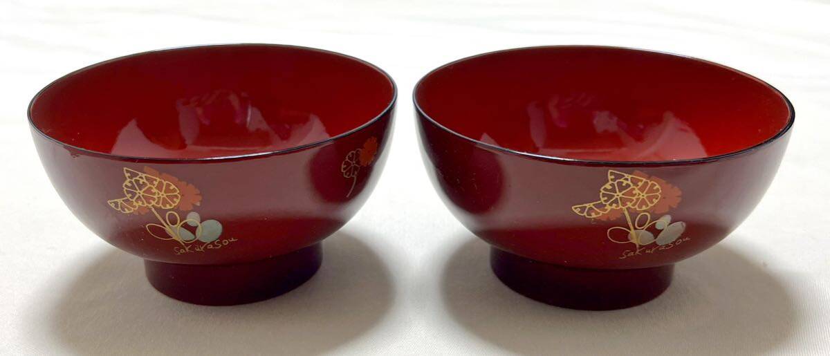 - 未使用 漆器 桜草柄 朱 汁椀ペア