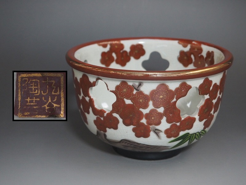 > B1099 九谷陶芸 造 梅文 透かし 菓子器 ☆ 茶道具 抹茶器 茶懐石 茶事 和食器 鉢 菓子鉢 盛鉢 盛器 九谷焼 陶器 在銘 陶印 美品 良品 無傷
