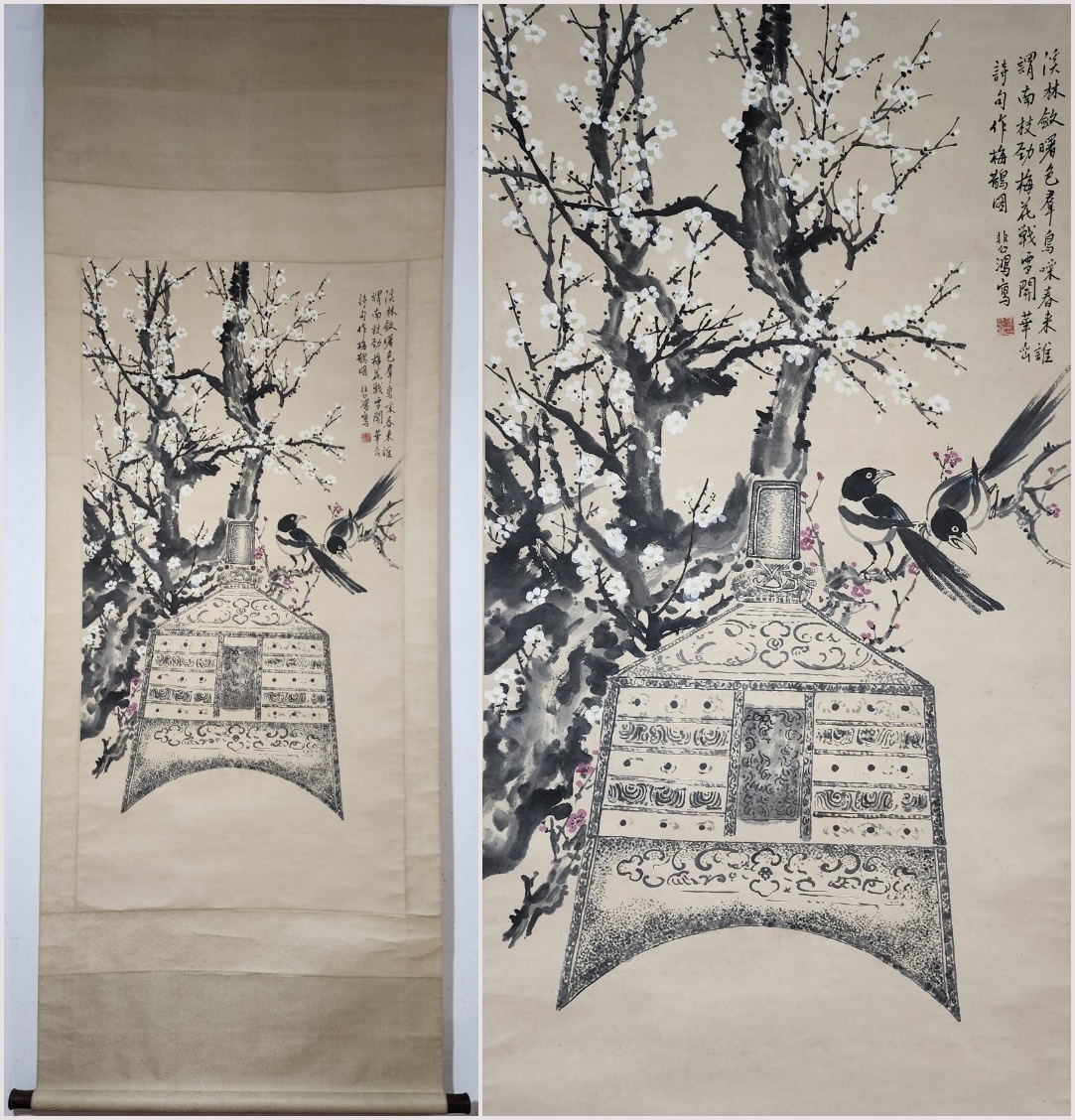 - 古美術 掛け軸 中国・近現代 「徐悲鴻書」 紙本 【喜上眉梢図】 立軸 書道 巻き物 真筆逸品 肉筆保証 唐物 古画 LT-24465