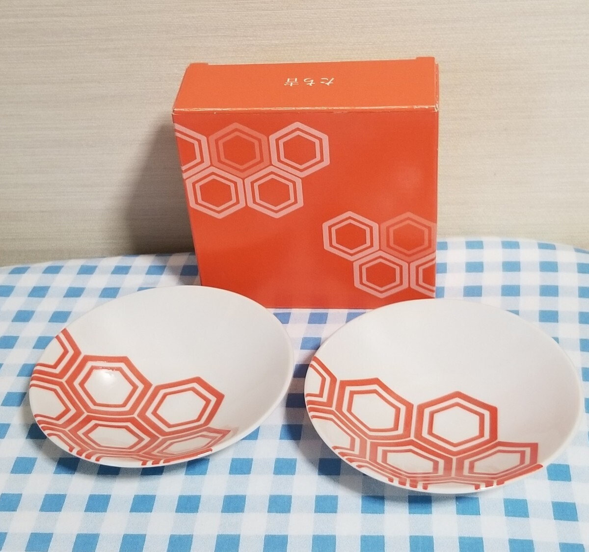 - T-300【新品/未使用】たち吉 磁器 皿 2枚/ペア 亀甲模様 和食器 贈答品 日本製