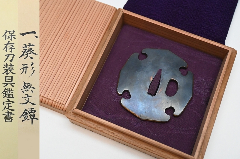 - 鍔■葵型 無文鍔 鑑定書 日本美術刀剣保存協会[約7.2×約6.7㎝×厚約4㎜ 重さ約110g] 赤銅磨地 側 金色■時代 刀装具 武具 桐箱入№9792■