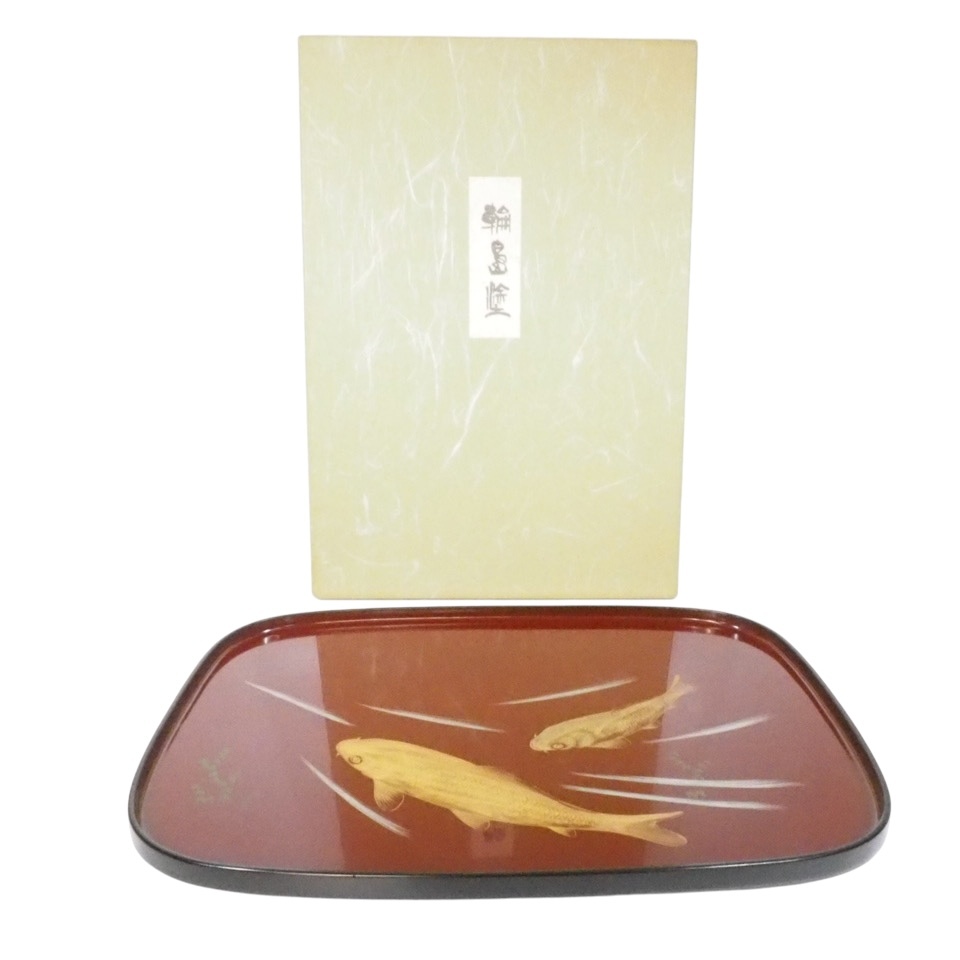 - 水の流れが表現された線彫が風情ある逸品!昭和ビンテージ 輪島塗 本木漆芸 廣井清華堂謹製「沈金鯉文盆」元箱付 1980年代 OTS605