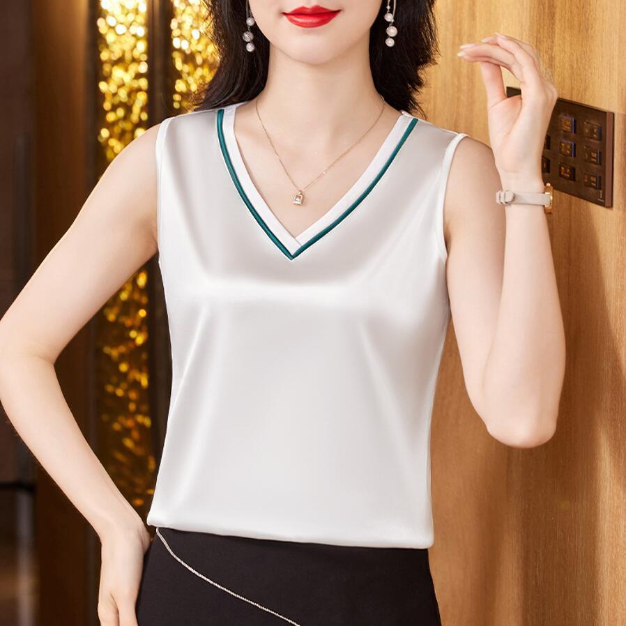 > 新入荷/ ブラウス シャツ レディース サテン ブラウス トップス 薄手 Vネック 透けない 楽チン 光沢 上品 おしゃれ /ホワイト