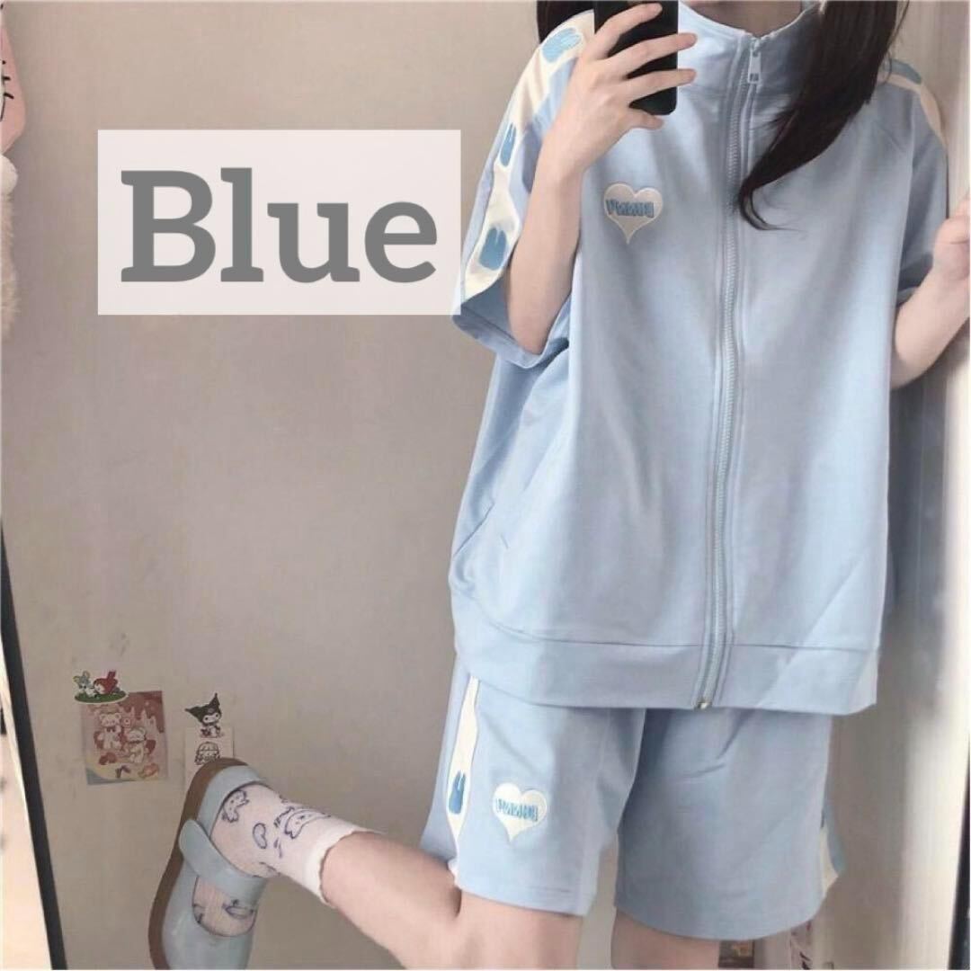 - セットアップ Tシャツ ショートパンツ ゆめかわ うさぎ柄 ライン ブルー