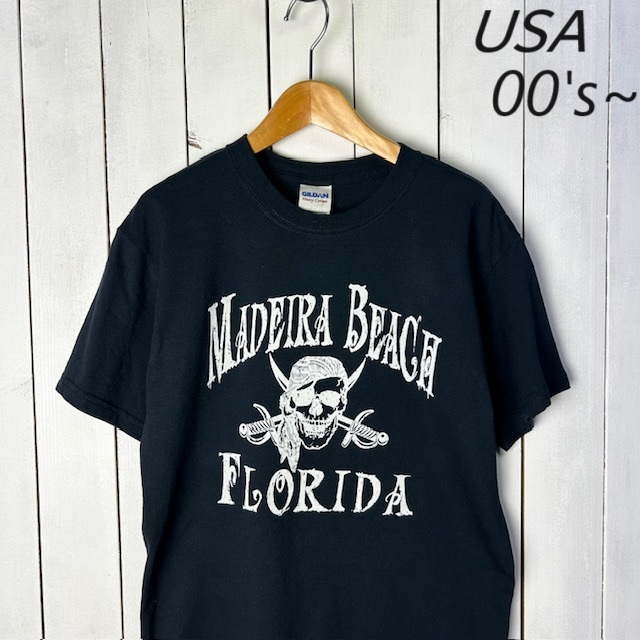 > T●118 USA古着 90s~00s 美品 MADEIRA BEACH Tシャツ 黒 S GILDAN オールド アメリカ古着 スカル ドクロ
