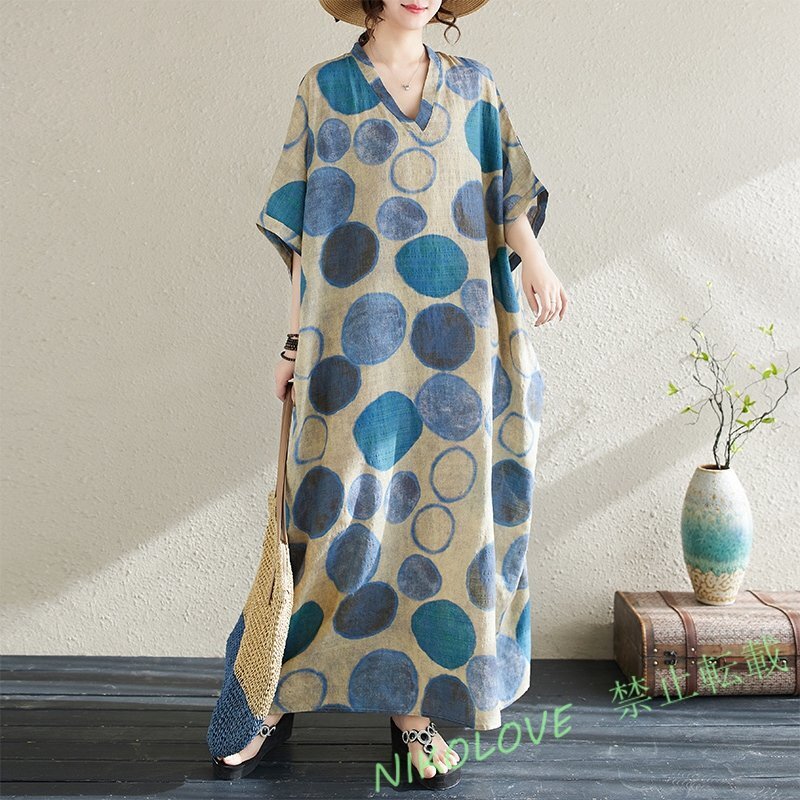 - 新品カジュアル オシャレ ゆったり大きいサイズ 体型カバー ドット柄 半袖 ロングワンピース F 青い LE606
