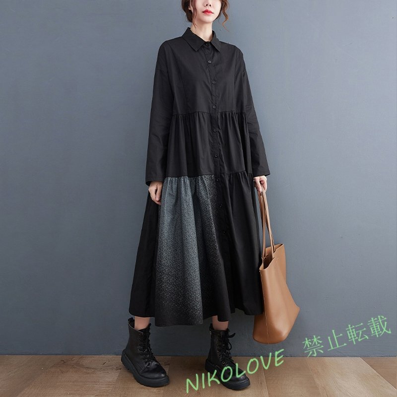 - 新品カジュアル プリント柄 切り替えゆったり大きいサイズ体型カバー ロング丈シャツワンピース L~XL黒 LE721