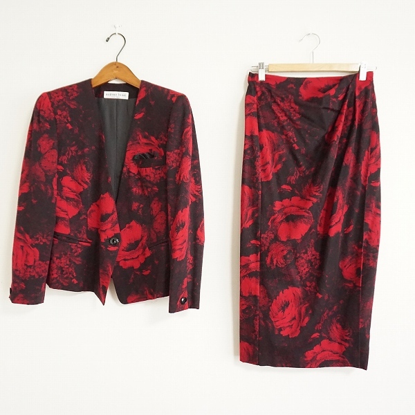 - #wnc マダムハナイ MADAMEHANAI ユキコハナイ YUKIKOHANAI スカートスーツ 赤 黒 ノーカラー 花柄 巻きスカート レディース [884855]