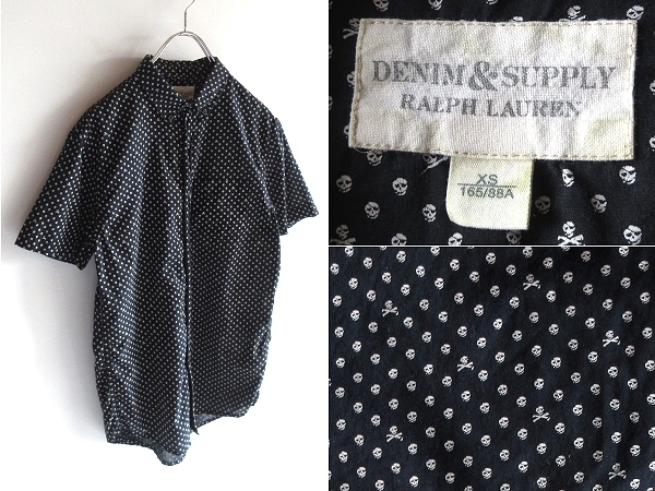- ネコポス対応 DENIM&SUPPLY RALPH LAUREN デニム&サプライ ラルフローレン コットン 総柄 スカルドットプリント 半袖 BDシャツ XS ブラック