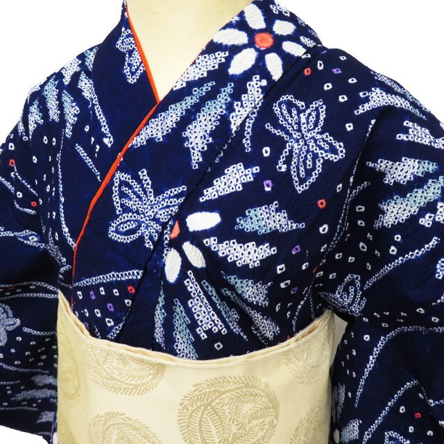 > 夏物 浴衣 着物 中古 木綿 カジュアル 絞り染め 花と蝶模様 濃紺色 多色 身丈154.5cm 裄67cm SA きもの北條 A1035-9