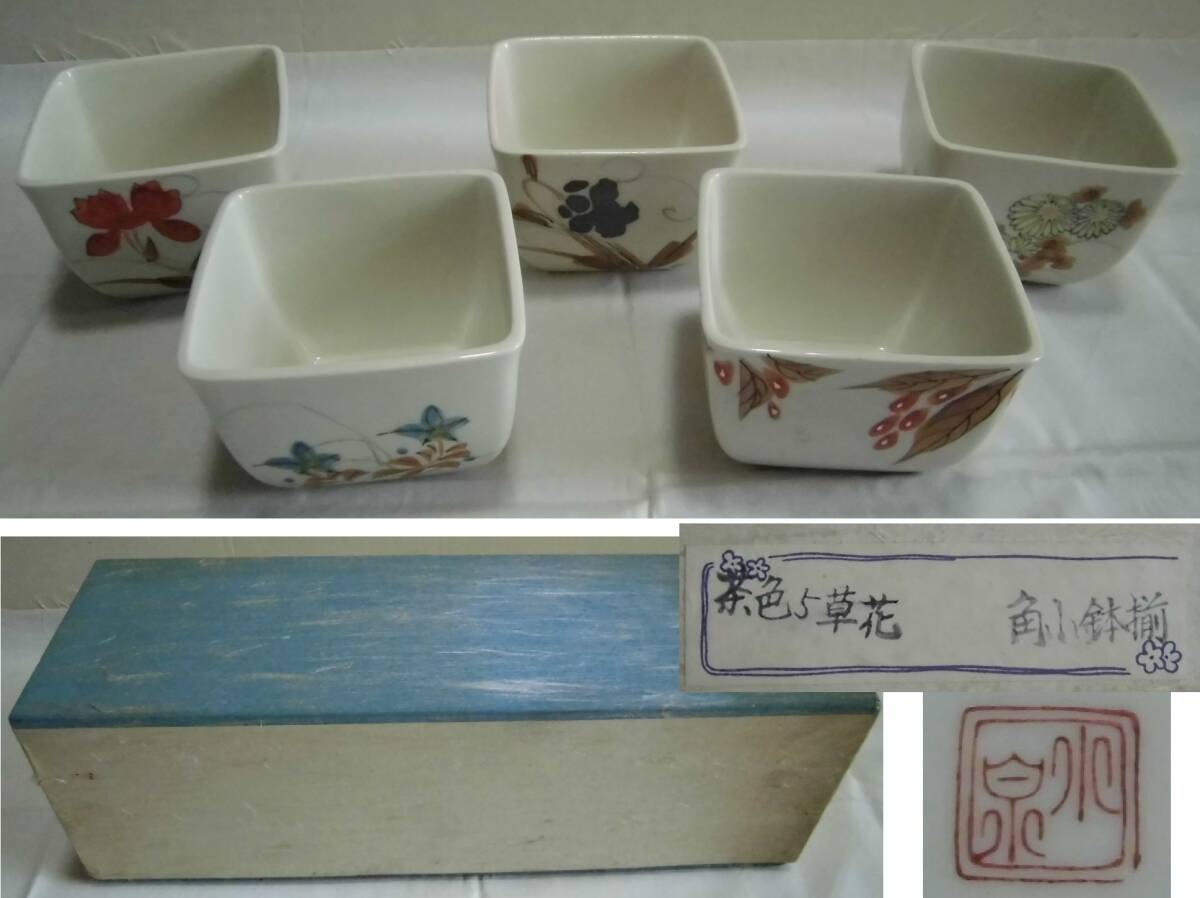 - 小鉢 角鉢 角小鉢揃 茶色5草花 水泉 柄違い 5客 箱入り 色絵 花柄 陶器 工芸品 食器 レトロ