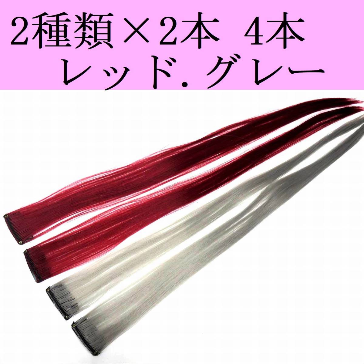 - ワンタッチカラーエクステ ストレート 2種×2本 4本セット レッド グレー 長さ54cm ロング ウイッグ 赤 灰色 コスプレ メッシュ つけ毛