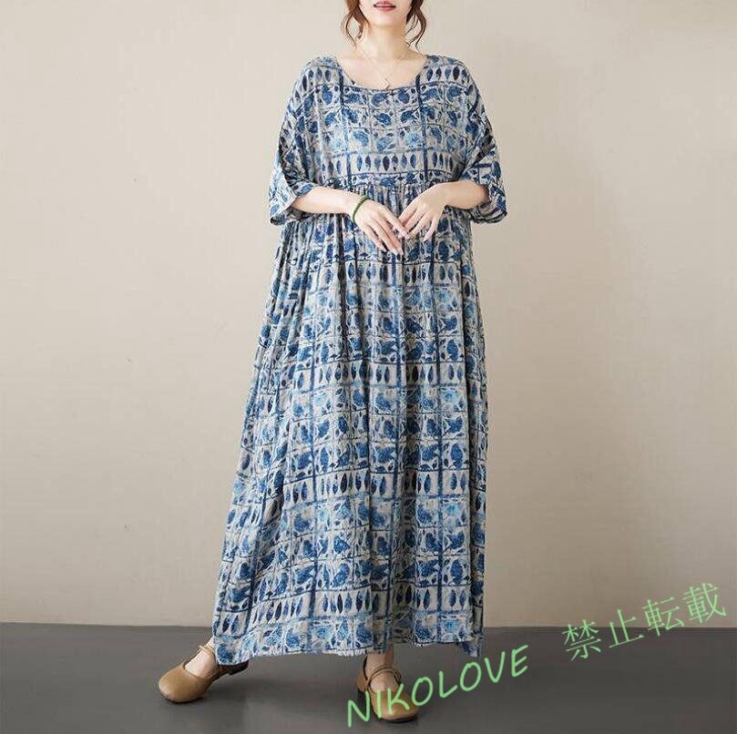 - 新品カジュアルロングワンピース 花柄 綿麻 半袖 ポケット付き ワンピース プリント 総柄 ゆったり 体型カバー フレアワンピースF LC109