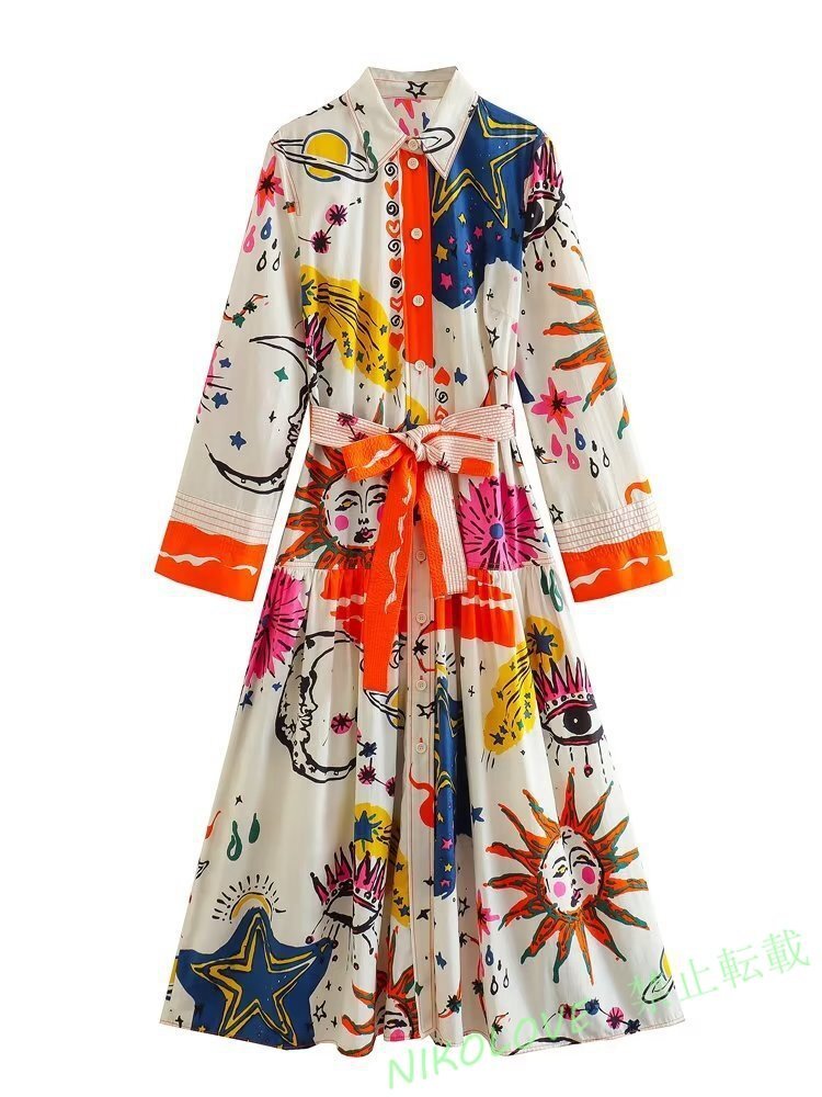 - 新品夏 レディーストップス ロング丈ワンピース 前開き長袖可愛い柄 Lサイズ LC136