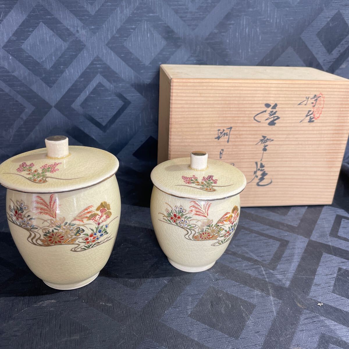 > 朝日堂 薩摩焼 共箱 夫婦湯飲み 湯呑み セット 蓋付き 金彩 昭和レトロ