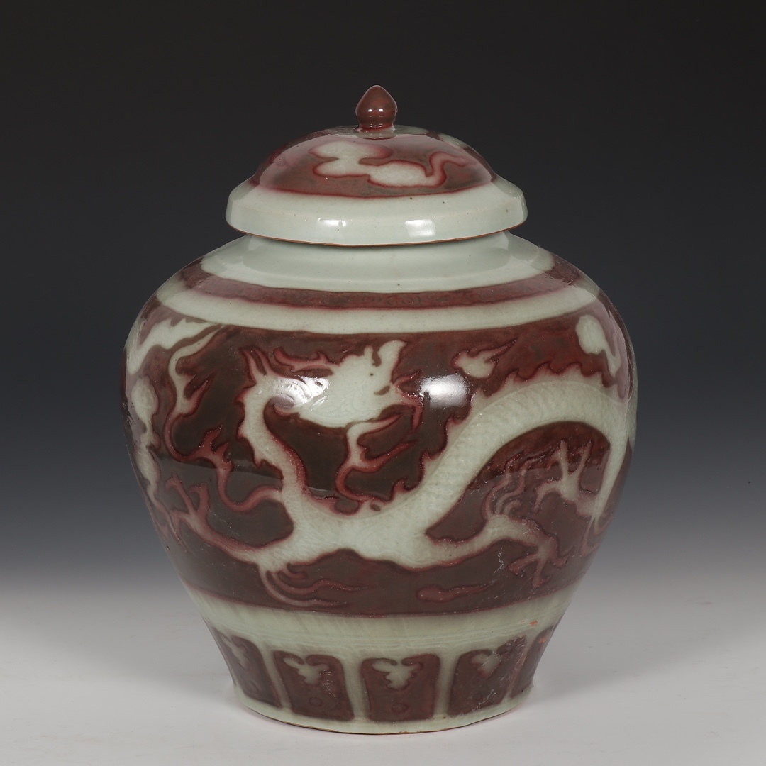 - 旧藏 釉里紅 龍文有蓋壺 蓋罐 唐物 箱付き 陶磁器 中国美術 珍品 置物 賞物 RG79
