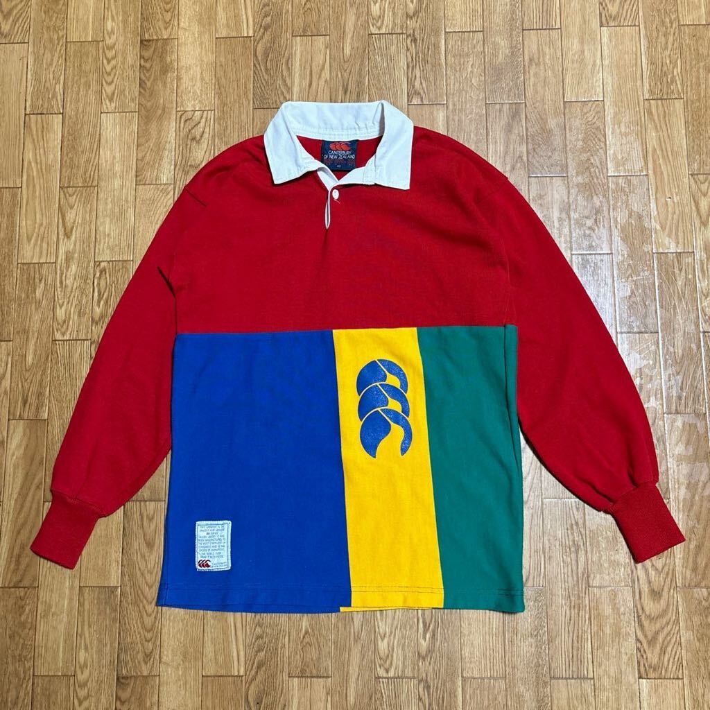 - 90s ニュージーランド製 CANTERBURY ラガーシャツ 長袖 赤 青 黄色 緑 40サイズ 古着 カンタベリー ラグビー
