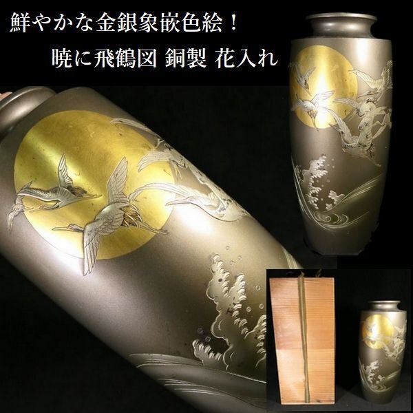 【 恵 #1197 】 鮮やかな金銀象嵌色絵! 暁に飛鶴図 銅製 花入れ 花瓶 「芳弘」在銘品拍卖