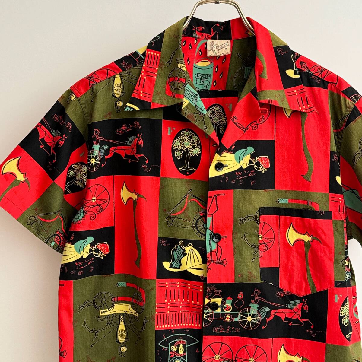 - 希少《 Mint Condition / Catalina 》40s50s 極上品【 Catalina カタリナ ビンテージ 馬車 人力車 総柄 コットン 半袖シャツ M 赤緑 】