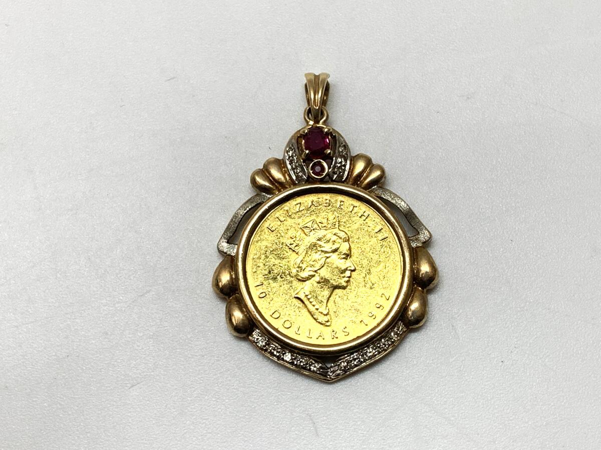 - 【送料無料】K24 24金 赤石 ダイヤ メイプルリーフコイン 金貨 ペンダントトップ 1/4oz/K18 18金 外枠 総計12.6g 投資 店舗受取り可