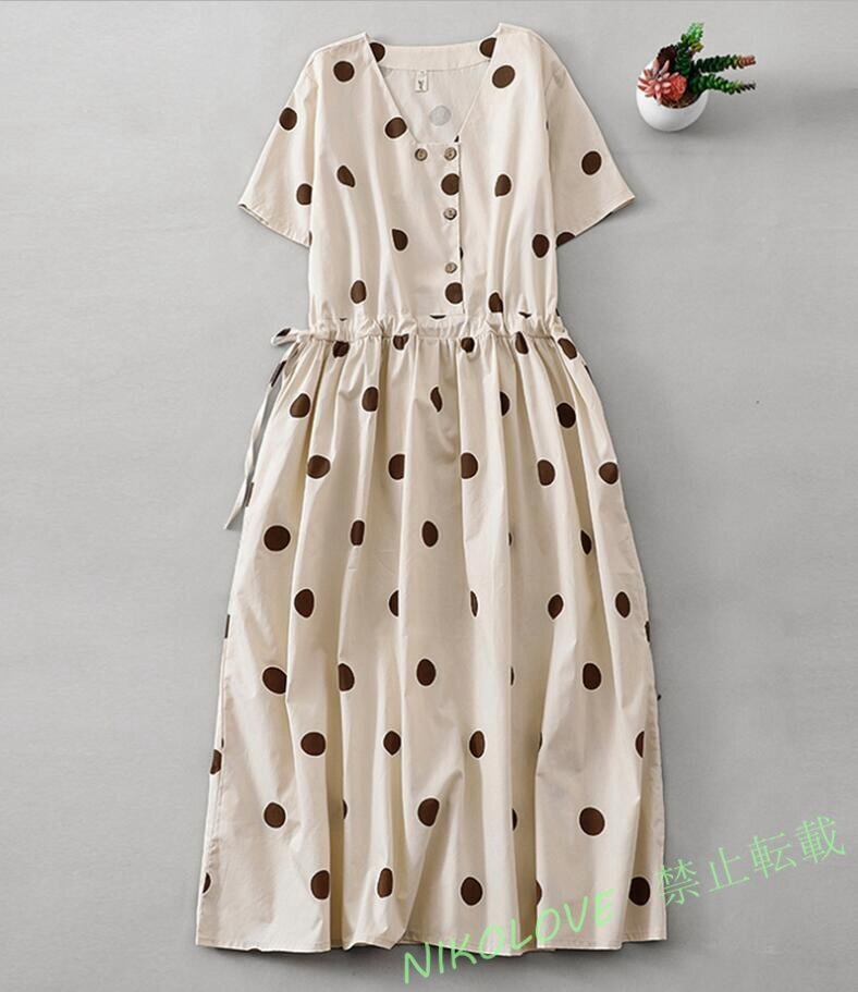 - 新品 夏 Aラインワンピース カジュアル ゆったり 夏 半袖 きれいめ 水玉柄 ロングワンピース 着痩せ 上品 マキシワンピース2XL LG918